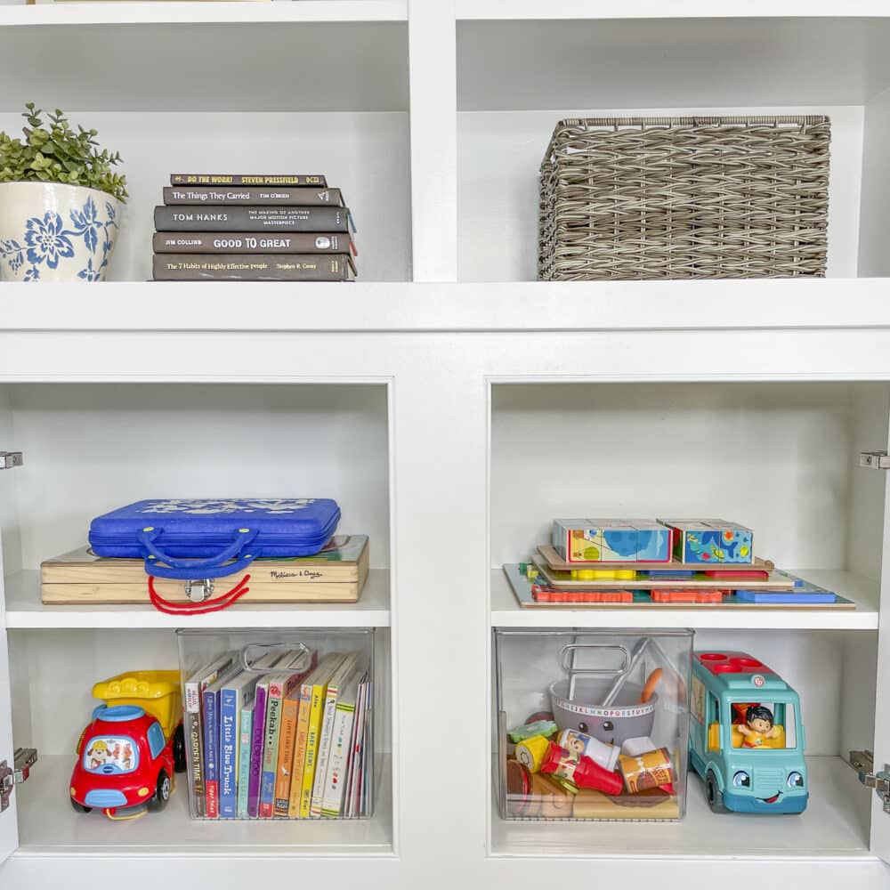 Organize toys into categories using clear bins to create a streamlined system that keeps clutter under control while letting your child easily see their options. This simple setup encourages independent play, makes cleanup faster, and helps toys stay in rotation instead of disappearing into a pile.