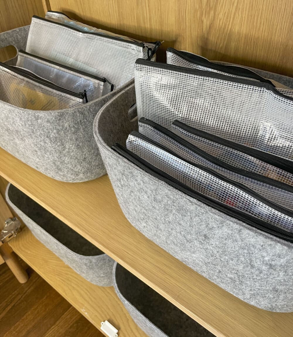 Store clunky games and puzzles in zippered mesh pouches to free up cabinet space while keeping each set neatly contained. Tuck the instructions and a cut-out image of the finished puzzle from the box into each pouch so everything you need is easy to find and quick to set up. Place the pouches into a bin and place on a shelf for easy access.