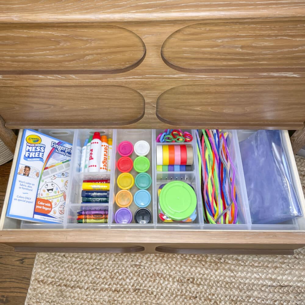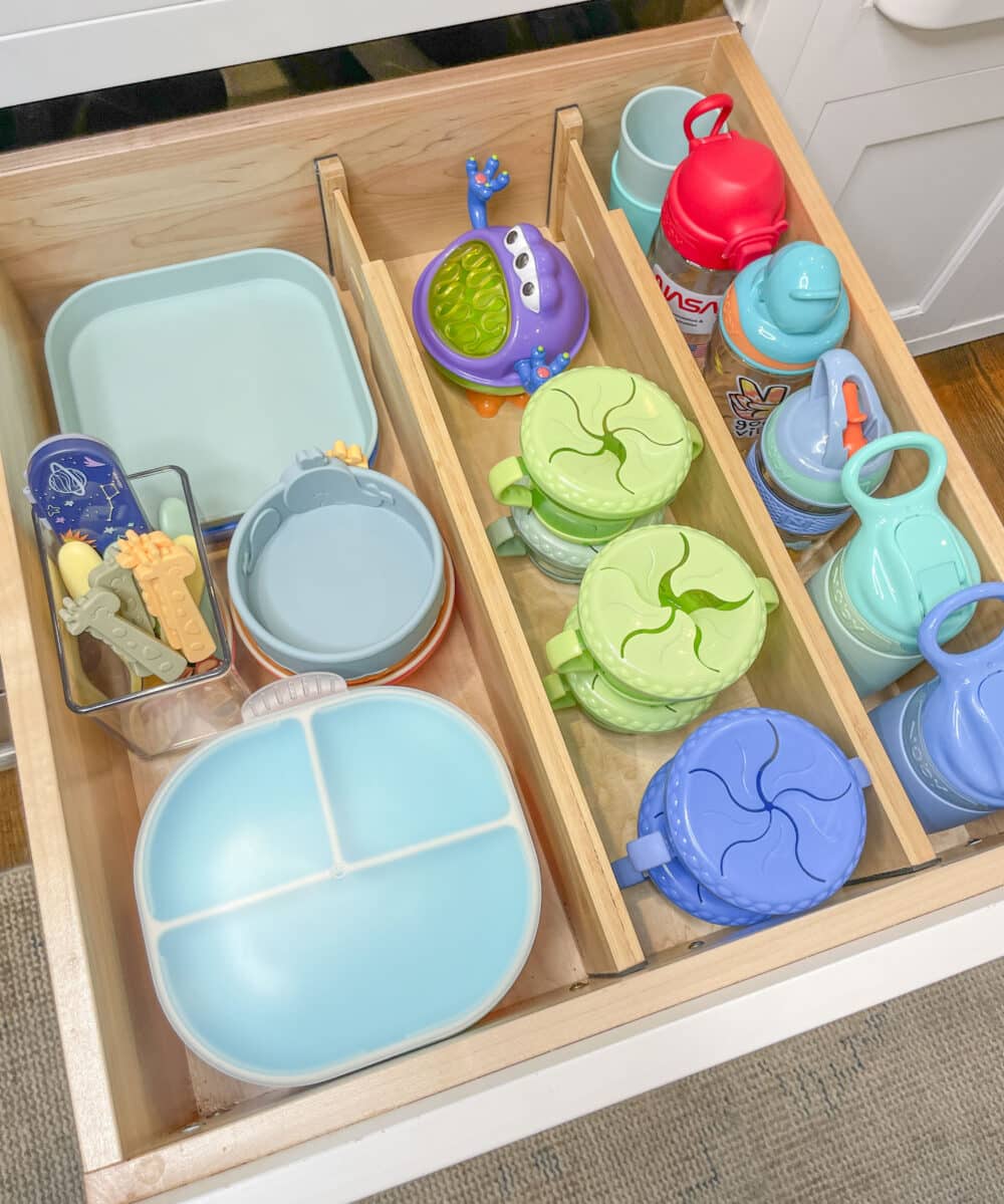 Kids’ dishes, bottles, and utensils can quickly become messy in open spaces like drawers and shelves. We recommend utilizing a deep kitchen drawer to organize dishware and bottles into categories with drawer dividers. For pesky cutlery, a tall drawer organizer does the trick! Bonus points if you can select a drawer low enough for your kids to access so they can start learning how to get their own dishware independently!
