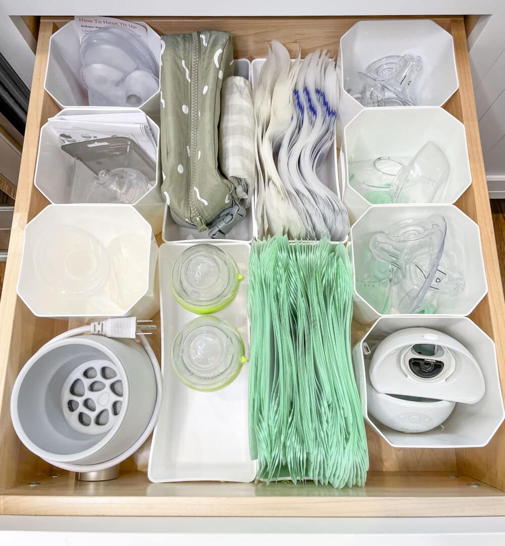 Create a nursing drawer to keep all your pumping accessories clean, organized, and ready to grab between sessions. We love using SmartStore inserts in narrow, medium, and tall to create sections for flanges, bottles, storage bags, and wipes all separate for easy access. Having everything in one place streamlines your routine, cuts down on stress, and makes pumping on a busy day feel far more manageable.