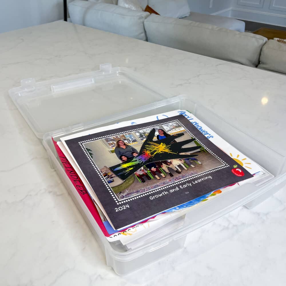 Keep your kiddos’ mementoes and artwork protected using storage boxes. These boxes are great because they can be filed on a shelf maximizing vertical space. Once the box is full, send the items to Artkive to create a coffee table book with the artwork, allowing you to declutter and start fresh!