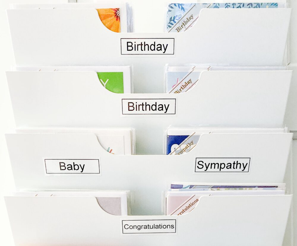 If a card doesn’t include a personal message beyond a signature, it’s likely not something you need to keep long-term. While the thought behind the card still counts, these quickly accumulate and create clutter in high traffic areas like entryways, kitchen counters, and home offices. If there’s no note, memory, or emotional connection attached to the specific card, it’s absolutely okay to recycle and make space for items that matter more in your memento box.