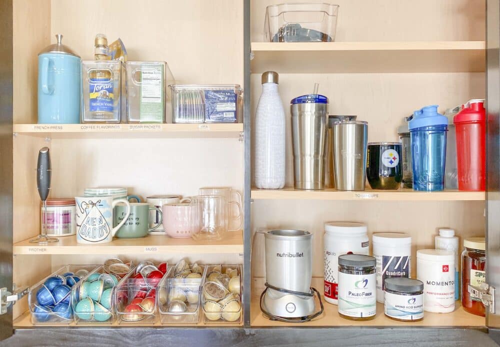 We say this often, but most people have far more mugs than they realistically use. Freebie mugs, souvenirs, and mismatched sets create crowded cabinets that make your morning routine clunky and time consuming. Keeping a small rotation of your main squeezes makes your kitchen easier to use and your mornings calmer.