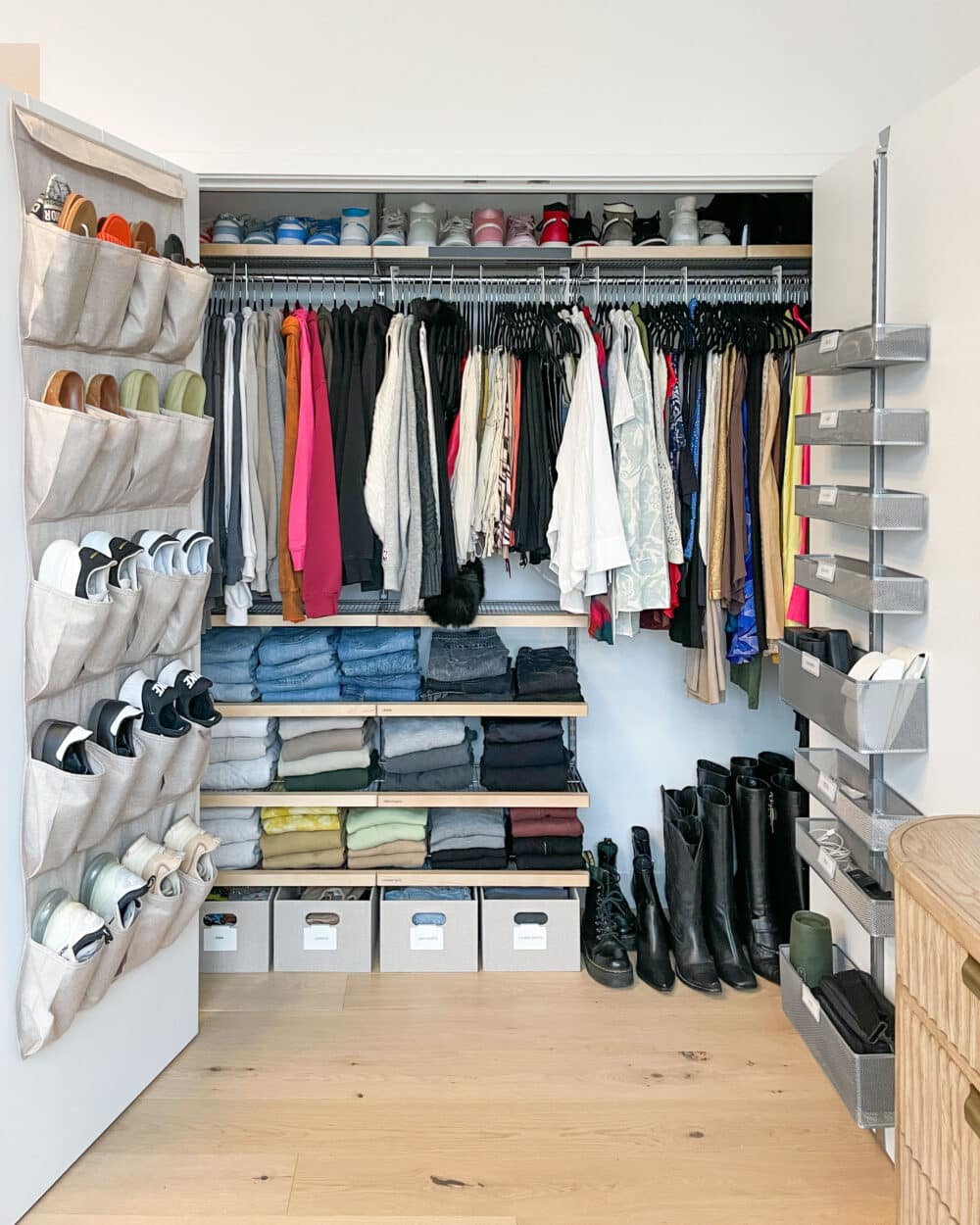Avoid mixing your shoe storage in with your hanging clothes. It makes it hard to see all your options without the extra step of pushing your clothing to one side of your hanging rod. Not to mention, it can take up valuable hanging space that we could all use a little more of! Back of door shoe organizers save space and allow you easy access to all of your shoes at once. These can be used for a variety of categories beyond shoes like accessories, winter gear, and grab & go items!