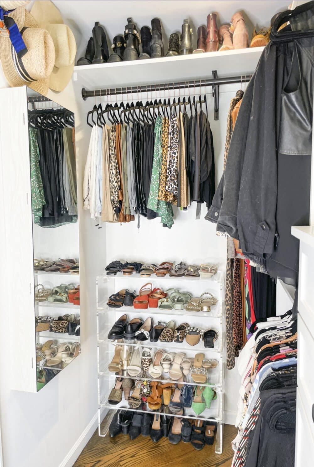 Instead, choose a flat, solid shoe shelf to keep your shoes upright, save space, and accommodate a wider range of styles and heights. Stackable options are key, allowing your storage to grow with your collection! These acrylic shelves and white wooden shelves are both flat and stackable, making them an easy upgrade for optimized shoe storage.